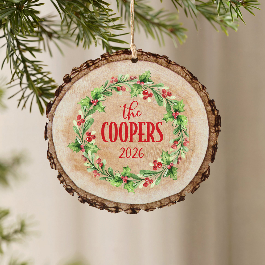 An artistic wreath of berries and holly add a little country Christmas elegance to this rustic wood ornament.