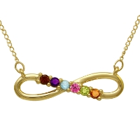 Fashionable, contemporary necklace symbolizes the eternal family bond that can never be broken. Stunning in either gleaming 10K yellow gold or sterling silver, it features the birthstones of those that are closest to her, beautifully set in a never-ending infinity symbol.