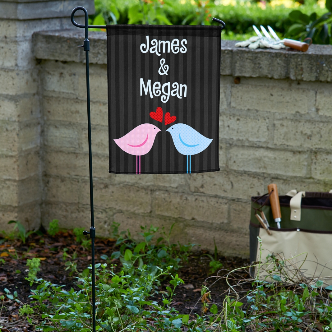 A Personal Creations Exclusive! A darling home accent for loving couples of all ages, our garden flag features a pair of smitten lovebirds. We personalize it with any message on 3 lines, up to 12 characters per line. All-weather, single-sided garden flag (14-3/4"L x 11-1/4"W) is made of durable nylon. Black wrought iron garden stake (39") is sold separately. Stake cannot be gift boxed.