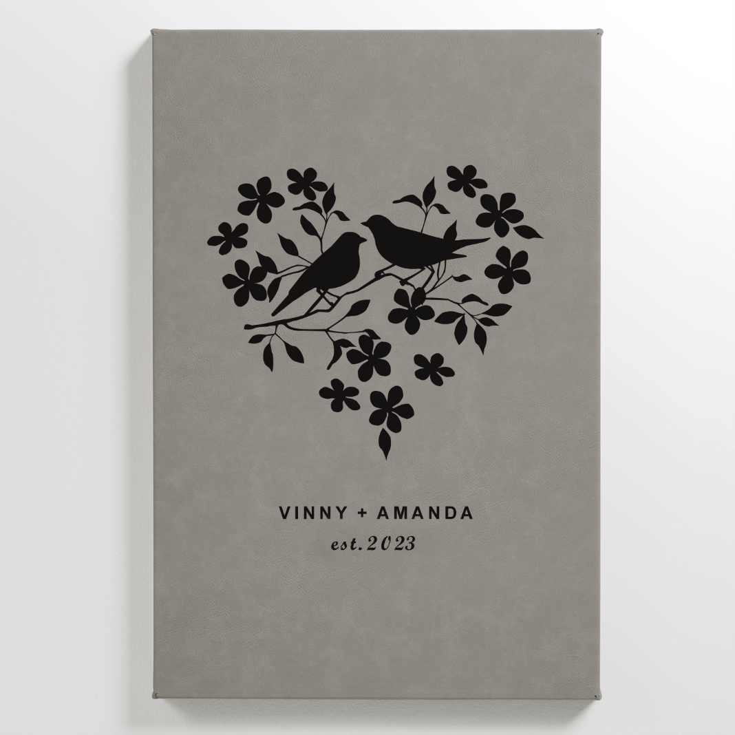 Love birds who adore nature (and each other) will want to feather their nest with this romantic artwork. Featuring the look and texture of leather, it offers an elegant backdrop for the sweet design, names and wedding date. You can almost hear them cooing sweet nothings to each other! Exclusively from RedEnvelope.