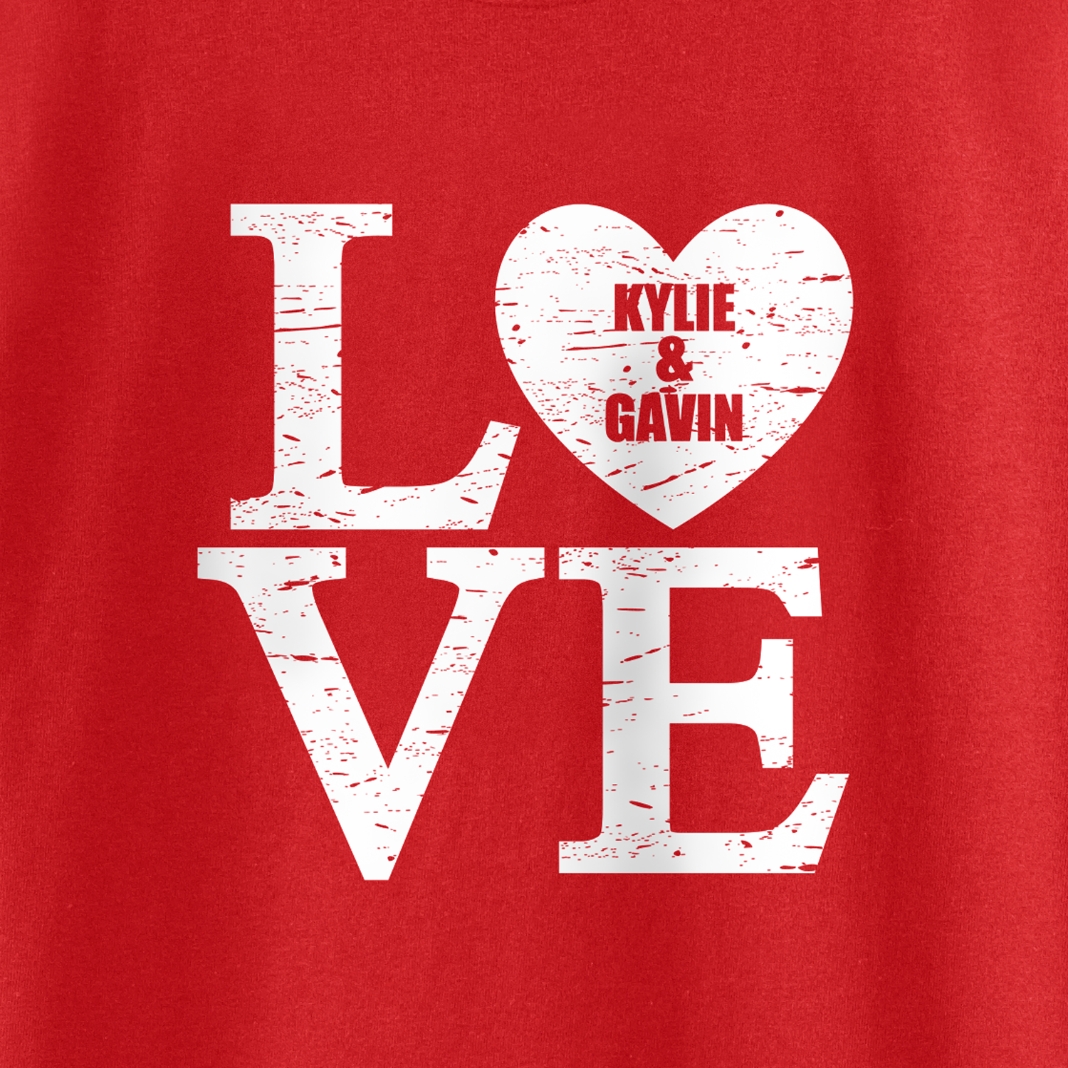 A Personal Creations Exclusive! T-shirt is made of a soft 100% cotton fabric and is available in adult sizes M-2XL. We personalize it with any 2 names, up to 10 characters. Machine washable.