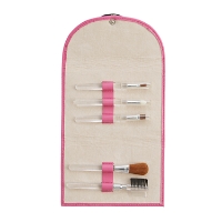 Ideal for touch-ups on the go, this 5-piece set contains the specialized brushes needed to create beautiful eyes, lips and cheeks. Set includes an eyelash comb/eyebrow brush, blush brush, lip brush, eye shadow brush and sponge tip applicator. The set is housed in a chic leatherette bag with a secure snap closure. Choose from black, blue, hot pink or lime green. We engrave the oval plate with any 3-letter monogram with raised middle initial (please specify order of initials) in script or block font, please specify. Measures 5”L x 3-1/2"W.