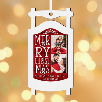 Sledding and merrymaking come together in this farmhouse-style ornament.