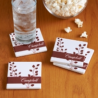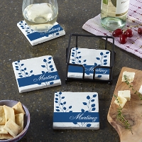 A Personal Creations Exclusive! Distinctive tile coasters protect your tabletop and reveal your sense of style. Choose from black, blue, brown, burgundy or gray design. We add any name, up to 12 characters. Coasters have protective cork backing and wipe clean easily with a damp cloth. Comes complete with an attractive black metal holder. Set of 4. Measures 4Lx4"W.