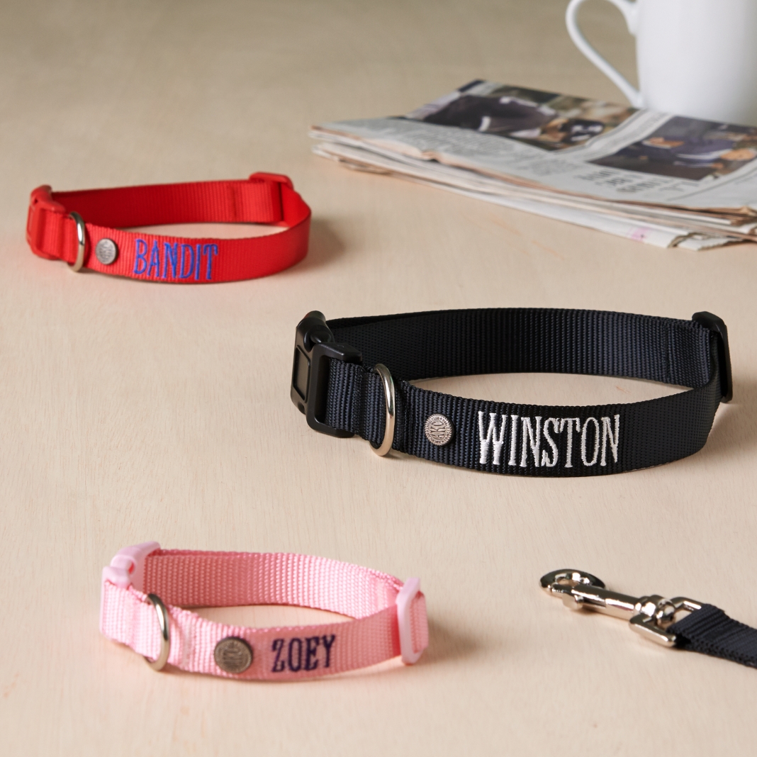 Finely crafted collar is made of a soft, fray-resistant nylon and has heavy duty stitching, a tough plastic buckle, and D-ring for added safety. Available in black, red or pink. We embroider any name, up to 9 characters. When ordering, please specify Small (10-13"L x 5/8"W), Medium (13-19"L x 3/4"W) or Large (16-24"L x 1"W).