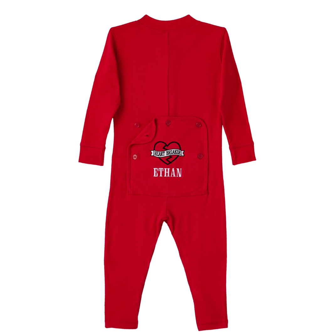 Comfortable playwear for your Valentine’s Day cutie! Our classically styled long johns feature buttons down the front and snaps along the legs. We embroider any name, up to 9 characters, on the button-up back flap. Available in sizes 3, 6,9, 12, 18, and 24 mos.,2T, and 3T. Made of a soft 95% cotton/5%spandex blend. Machine washable. Exclusively from Personal Creations.