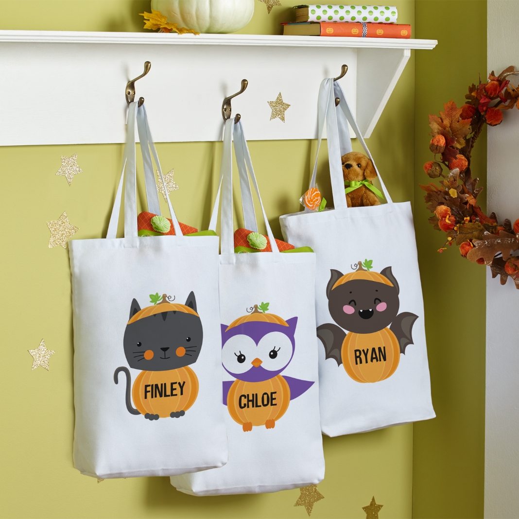 A Personal Creations Exclusive! Little trick-or-treaters will love these treat bags, featuring pumpkin pals as sweet as the candy inside them.