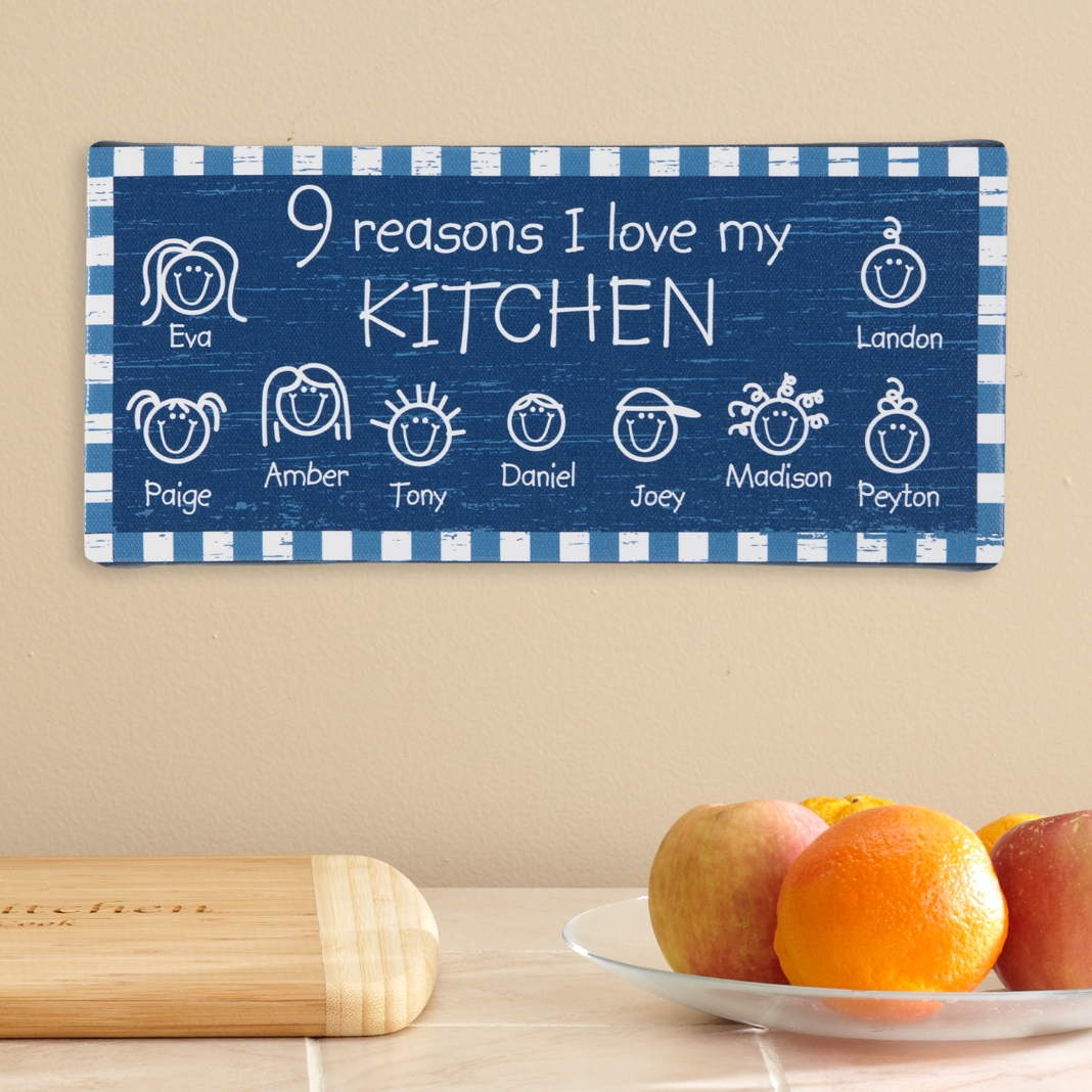 A Personal Creations Exclusive! Brighten your kitchen with the ones you love displayed on our attractive canvas! Measures 5”W x 11”L comes complete with our small wood easel. We personalize with any 2 digit number, any title (kitchen, family, etc.) up to 9 charactes, up to 12 icons (choose from Dad (spike, casual, business or part), Mom (long flip, curly, straight long or bob), Boy(spike, casual, baseball cap or part), Girl (long flip, pig tails, curly or straight), Baby Boy, Baby Girl, Cat or Dog) with any name 9 characters each. Choose from pink, purple or blue design. Canvas is stretched over a solid wood frame.