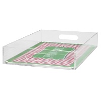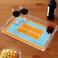 Gleaming rectangular tray is marvelous for serving drinks and coffee or as a stunning tabletop accent. Crafted of high-grade clear acrylic, it features cut-out handles and protective pads on bottom. We personalize it with any name, up to 12 characters, or any single initial. Choose from black, blue, brown, burgundy or gray design. Personalization is in the color shown. Measures 11”L x 17”W x 2-1/4"H. Hand wash.