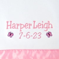 A Personal Creations Exclusive! Classically styled blanket is a must-have for new parents. It’s crafted of soft-to-the-touch cotton, polyfilled for extra warmth, and then trimmed with a smooth satin and gingham border. When ordering, please specify pink with Butterflies or blue with Cars. We beautifully embroider baby’s name, up to 15 characters, and any numeric date, up to 6 characters. Measures 40"L x 30"W. Machine washable.