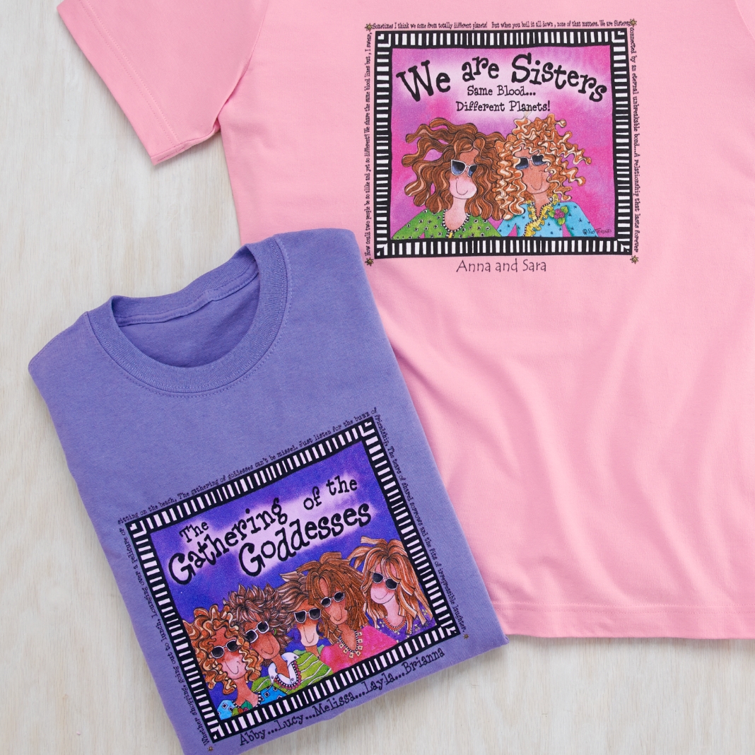 A Personal Creations Exclusive! Choose “We are Sisters” or “Gathering of Goddesses” T-shirt, designed by renowned artist and writer Suzy Toronto. T-shirt is available with 2-6 Sisters or Goddesses in your choice of ethnicity (Caucasian, African American or Hispanic) and hair color (brown, black, blond or red). We personalize it with any names, up to 10 characters each. T-shirt is made of a soft 100% cotton fabric and is available in adult sizes M-2XL. Design is on the color of the shirt shown. Machine washable.