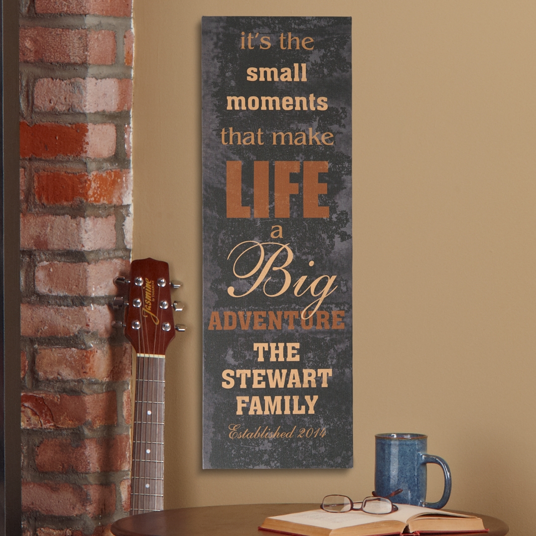 Whether it’s a compliment, a dinner together, or a day at the beach—our handsome art canvas is a warm reminder to cherish the little things that make families closer. We personalize it with any family name, up to 12 characters, and any year established. Choose from 6"L x 18"W or 9"L x 27"W size. Canvas is stretched over a solid wood frame. “The” and “Family” will always appear. Exclusively from Personal Creations.