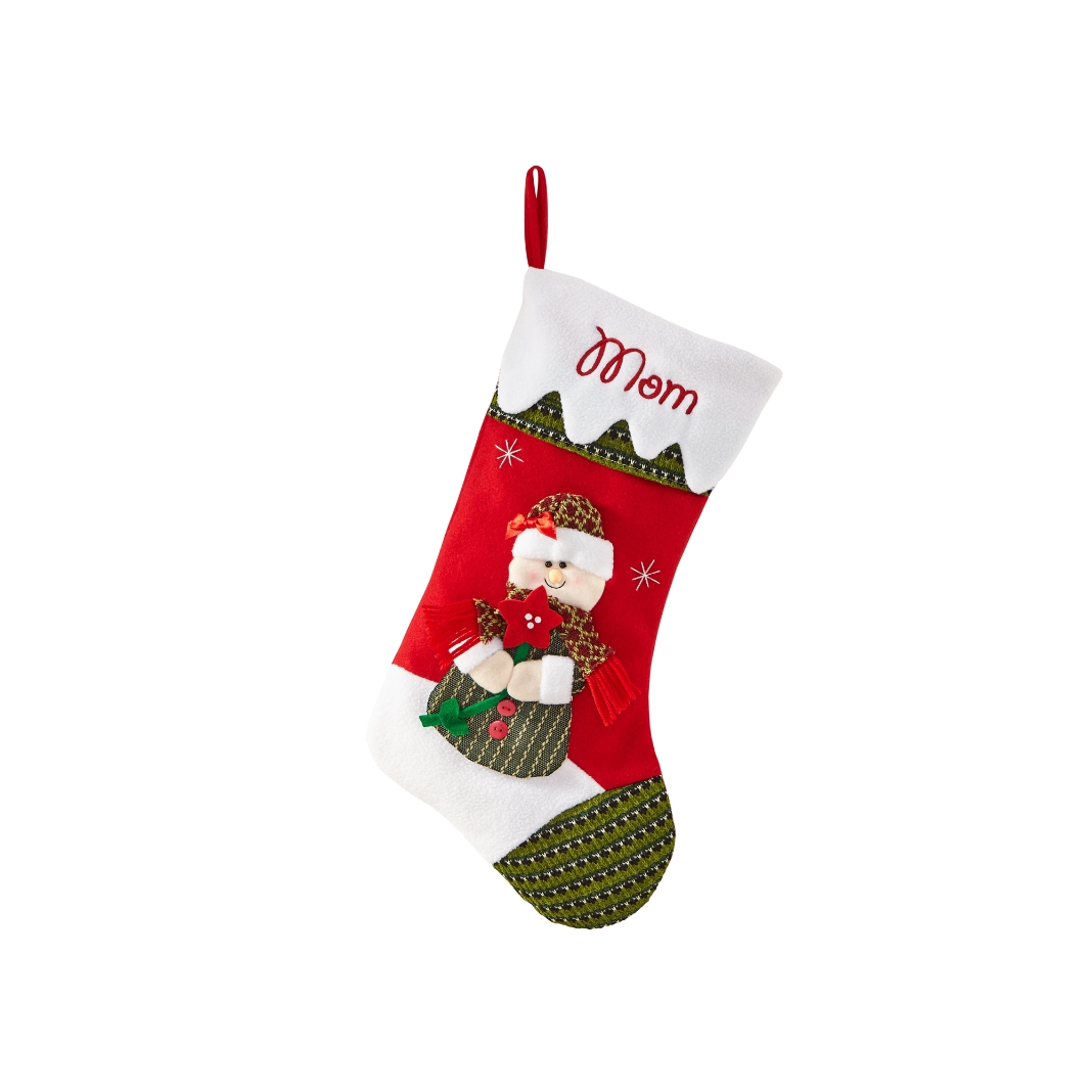These beautiful 3-D stockings feature cuffs resembling snow drifts. Available in your choice of a Dog, Cat, Gingerbread Man, Gingerbread Woman, Polar Bear, Bear, Snowman, Moose, Penguin, Mrs. Claus or Santa design. We embroider any name, up to 12 characters. Made of polyester fleece, stockings measure 19" L and 8 1/2" W.