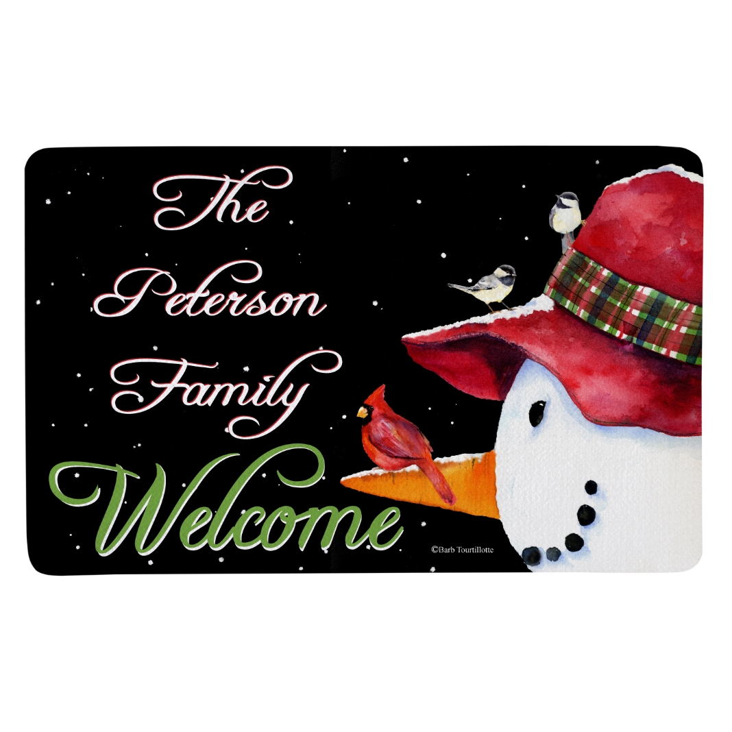 Three little birds have found a perch atop this friendly snowman. We personalize our with any message on 3 lines, up to 12 characters per line.