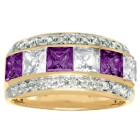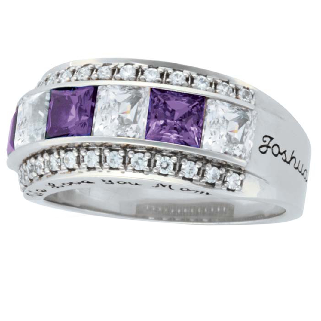 Delight her with a gorgeous ring in an up-to-the-minute style that works with everything. This dazzling ring features 6 spectacular princess-cut gemstones accented with 26 sparkling round cubic zirconia stones. We engrave both the outer and interior band to make it a meaningful tribute to love and family.