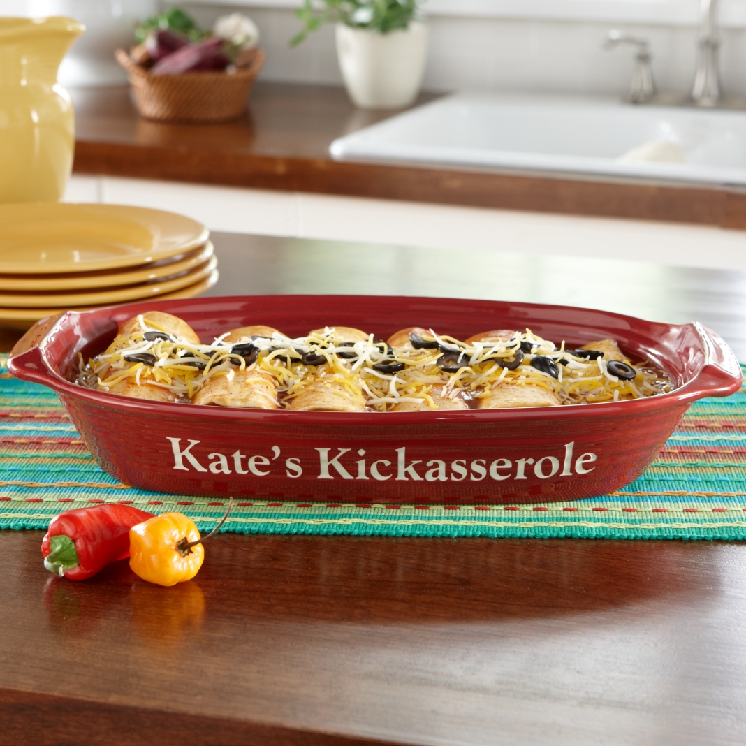A Personal Creations Exclusive! With its flared edges and stylish colors this will quickly become your "go to" dish. Measures 16 1/2" L x 10" W x 2 1/2" H. Holds about 10 cups. Choose from 3 glazed colors: cobalt blue, burgundy or deep green. We skillfully hand-etch the glaze away revealing your message in the bisque stoneware. We personalize with any message on 1 line, up to 25 characters. Our stoneware dish is lead-free, microwave, oven and dishwasher safe. Item cannot be gift-boxed.