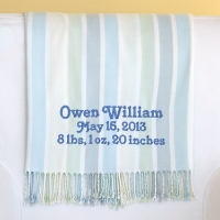 A Personal Creations Exclusive! Subtle, multi-colored stripes give our incredibly soft and snuggly fringed baby blanket a bit of sophistication. We create a treasured keepsake by embroidering baby’s name, up to 25 characters; birth date, up to 25 characters; and birth weight and length, up to 25 characters. Choose between pink or blue. Measures 30"L x 40"W. Made of 100% acrylic. Machine washable.
