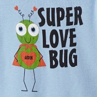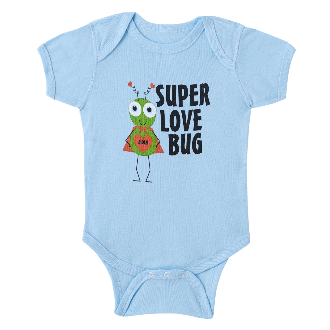 Our Valentine’s Day superhero is ready for action in heart bobbers and a red cape! Bodysuit is made of a soft 100% cotton fabric and features snap convenience. Available in sizes 6, 12, 18 and 24 mos. We add any name, up to 10 characters. The words "Super Love Bug" will always appear. Machine washable. Exclusively from Personal Creations.