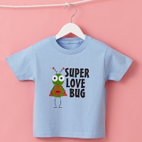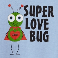 Our Valentine’s Day superhero is ready for action in heart bobbers and a red cape! Our T-shirt is made of 100% cotton jersey and features a ribbed crew neck. Available in sizes 2T, 3T, 4T and 5/6T. We add any name, up to 10 characters. The words "Super Love Bug" will always appear. Machine washable. Exclusively from Personal Creations.