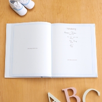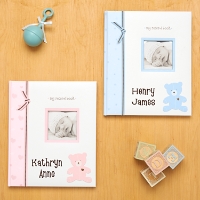 Record your little one’s milestones in this darling journal and photo album in one. The cover has a delicate ribbon accent and an opening for a photo of baby. Inside includes many pages to fill out important baby information and add photo's. We personalize it with any message on 2 lines, up to 12 characters per line. Choose from pink or blue. Measures 11-1/2"L x 9"W x 1"H.