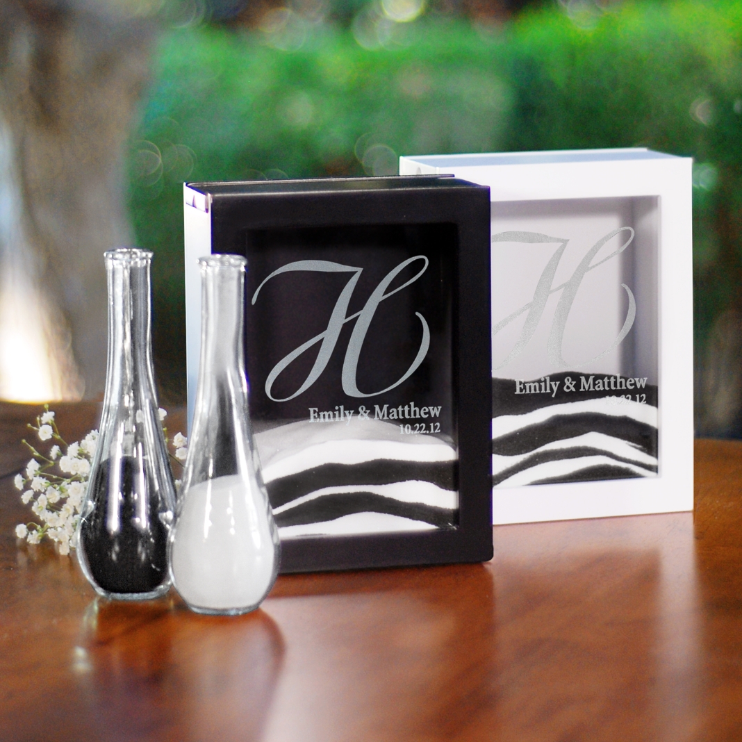 An unmatched trend in wedding day alternatives, our Unity Sand Ceremony Shadow Box Sets are as sleek as they are refined. In addition to being a testament of your union, this unique set also makes a wonderful decoration for your bedroom or living area after the wedding day is done. Features a large shadow box, personalized glass insert, and two pouring vases. For best result we recommend putting sand in the shadow box before use. Vases are not meant to fill entire box. We personalize the sand ceremony shadow box with a single initial, two first names, up to 12 characters each and a numeric date. Choose from black or white. Shadow box measures 8"H x 6"W x 3"D. Holds up to 80 oz. Two pouring vases measure 7" tall by 2.1875" dia. Holds up to 5.6 oz. Made of glass and wood. Sand is not included.