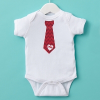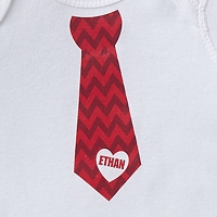 A Personal Creations Exclusive! Your valentine will be so dressed up and handsome in this tie bodysuit and T-shirt. Bodysuit is made of soft 100% cotton fabric with snap closure. We personalize any name up to 10 characters. Bodysuit is available in sizes 6,12,18,24mos. Machine wash.