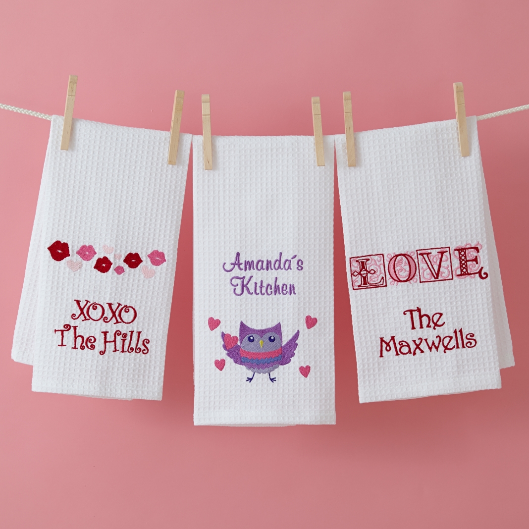 Bring the playfulness of Valentine’s Day into your kitchen with our pretty waffle weave hand towel. Choose from Lips, Owl or LOVE design. We embroider any message on 1 or 2 lines, up to 12 characters per line. Towel is made of absorbent 100% cotton. Machine washable. Measures 27"L x 18"W. Exclusively from Personal Creations.