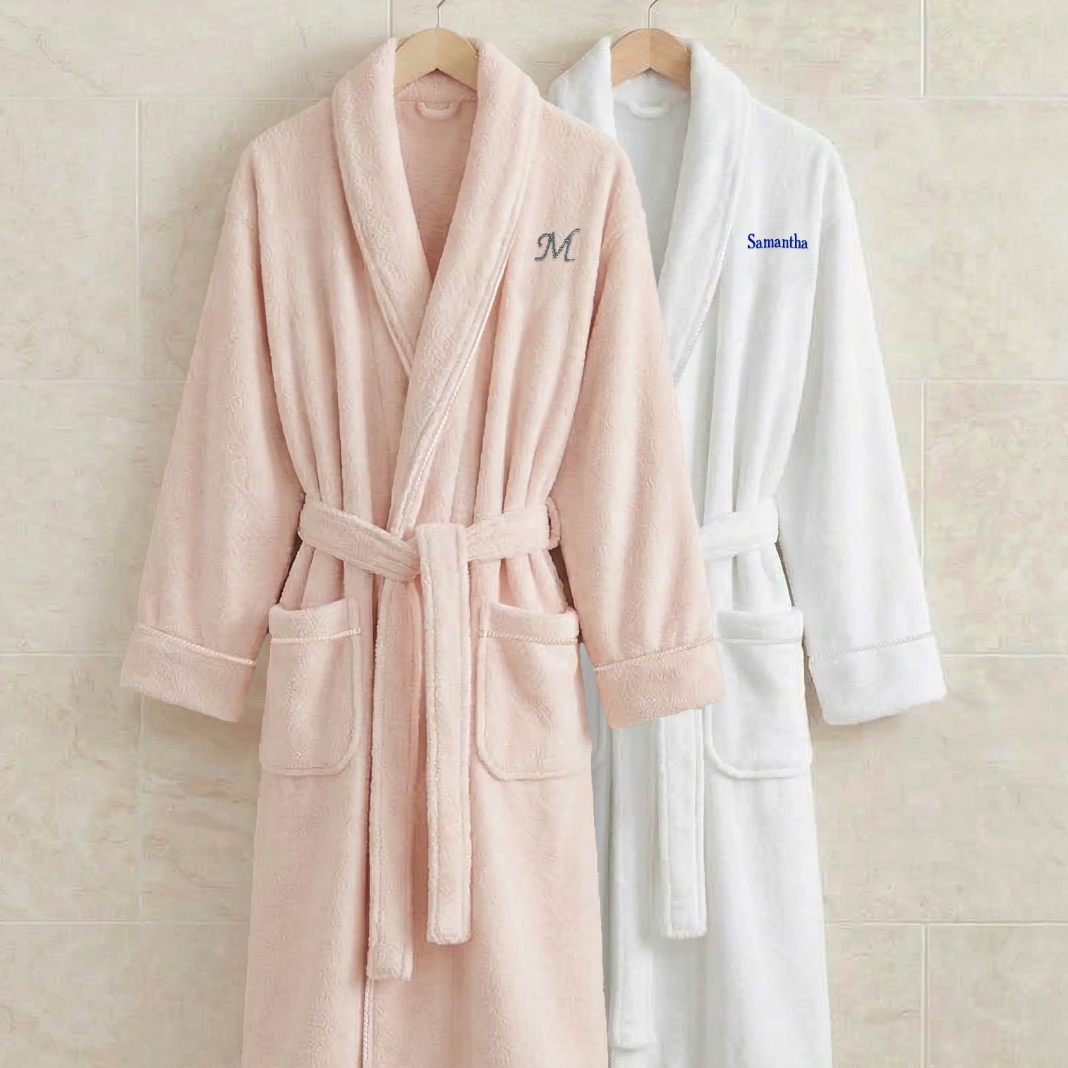 - Available in blush robe with gray or cream thread or white robe with gray or sea blue thread