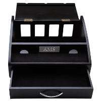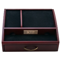 A Personal Creations Exclusive! Sophisticated dresser-top wood valet comes with either a black or cherry finish (please specify) and includes a pull-out drawer with brass hardware accent on cherry finish or silver plated hardware on black finish. Excellent storage for jewelry and pocket essentials, the top of the box has 3 divided sections. Slots in the rear allow for easy wire organization and convenient charging. The black valet features a silver plaque; cherry valet features a bronze plaque. We laser engrave his 3 initials. Valet is lined with soft black velvet. Measures 4-3/4”H x 11-1/2”W x 10"D.